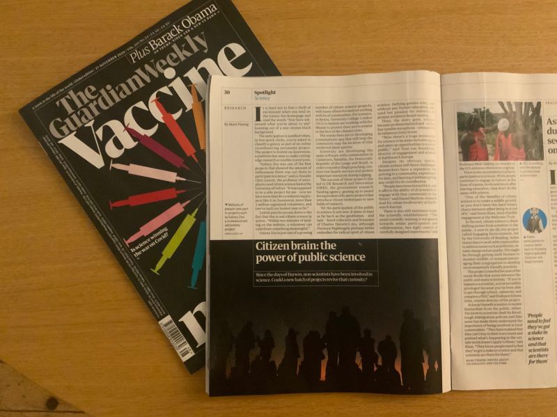 December 2, 2020 markpiesing Citizen brain: the power of public science A great weekend surprise!Great to see my recent piece on citizen science for The Guardian online in print in The Guardian Weekly magazine – and with a new title. You can read the original here, Share this: Share on X (Opens in new window) X Share on Facebook (Opens in new window) Facebook Print (Opens in new window) Print Email a link to a friend (Opens in new window) Email Share on LinkedIn (Opens in new window) LinkedIn Like this:Like Loading... Related